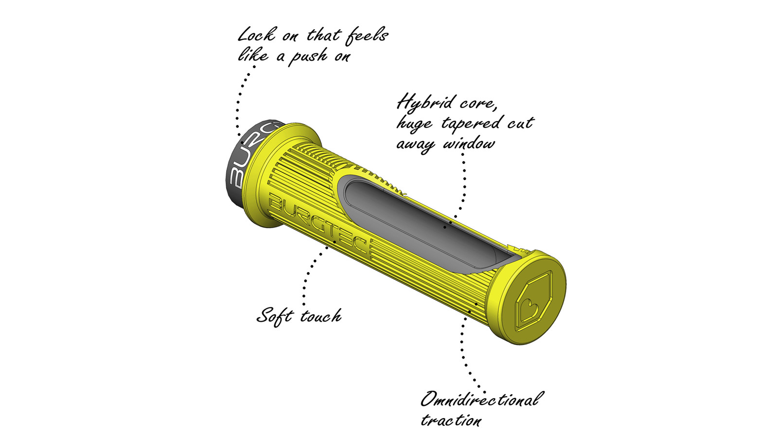 Rat's style is loose and flowy, but he needed a dependable grip that he could fit and forget. The mission was to get the soft touch of a push on with none of the wire, glue, 'throttle grip' or hassle. Engineering brains and bro science split the atom to create our new hybrid core. This gave all the push on 'feels' but with the rock-solid dependability of a traditional lock on. A huge tapered cut away window on top of the grip, under your 3 outside knuckles, removes the plastic core that can be harsh, and adds rubber all the way to the bar. The extra rubber gives you all the tragic industry buzzwords in one place; damped, fatigue reducing, compliant. The truth is, this section just gives hella comfort and makes those calluses a little less tender after a big day of swingin' off it. So you're all set to do the same again tomorrow, and the next day…